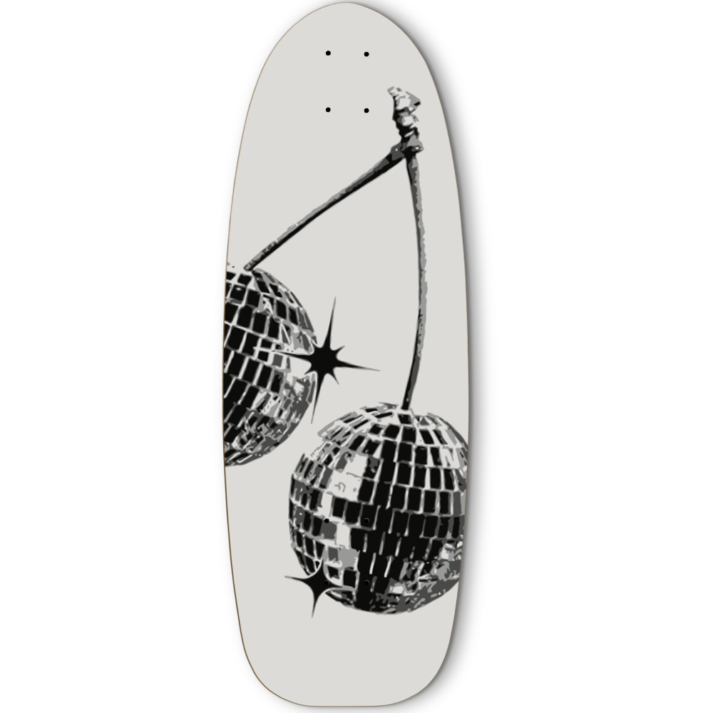 This decorative skateboard deck features a bold, imaginative design where classic cherries are reimagined as disco balls, set against a sleek grey and black backdrop, bringing a retro-futuristic vibe to an otherwise moody, minimalist palette.