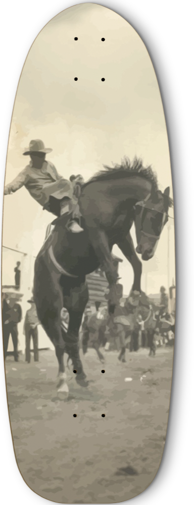 This skateboard features a striking vintage design centered around a cowboy riding a galloping horse, rendered in classic Western illustration style. The artwork evokes a sense of open plains and timeless adventure, with intricate detailing that captures the movement and spirit of the Old West. The color scheme is built around soft, muted beige tones, lending the piece an aged, sun-worn appearance that enhances its nostalgic charm.