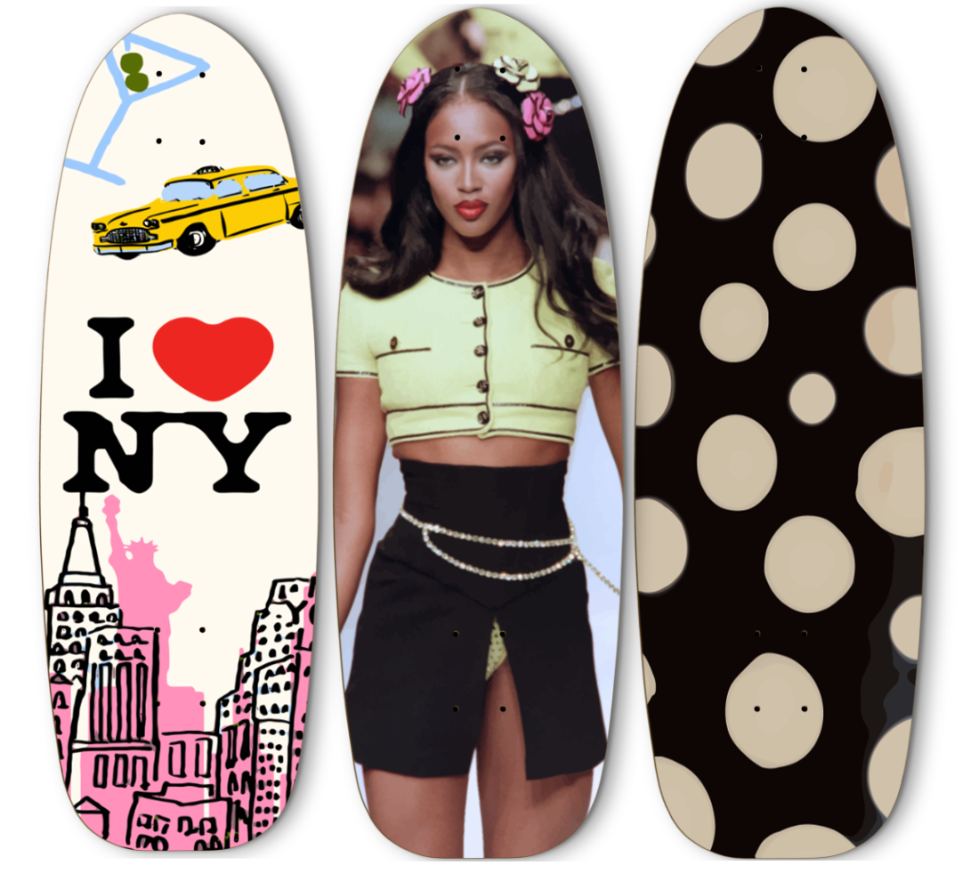 This skateboard set includes: I <3 NY | Timeless Icon | Moon Dots