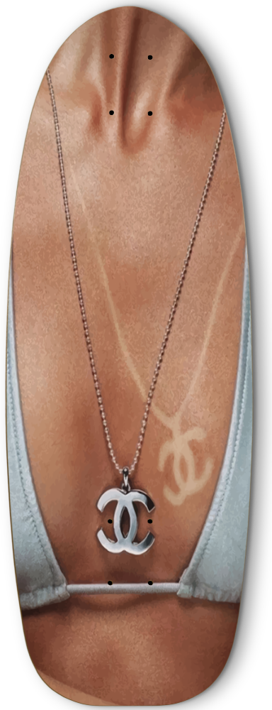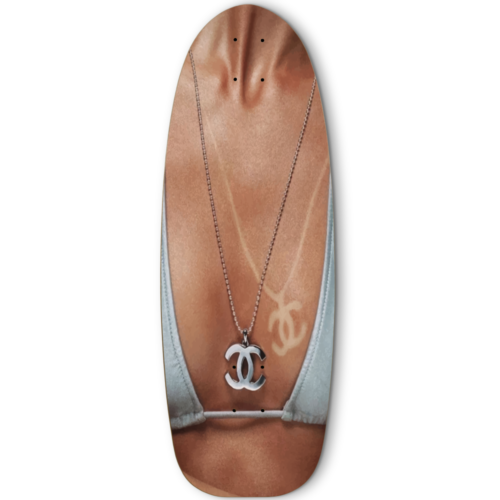 This one-of-a-kind skateboard turns heads with its bold beach-ready look. Sporting a snug blue bikini top, yet subtle yet unmistakable luxury logo tan-line—a faded designer imprint—adds that extra flair of high-end sunbathing gone rogue! Hang it on your wall or lean it in the corner, because it’s the perfect decor piece to give your room a playful, rebellious edge with a splash of summer.