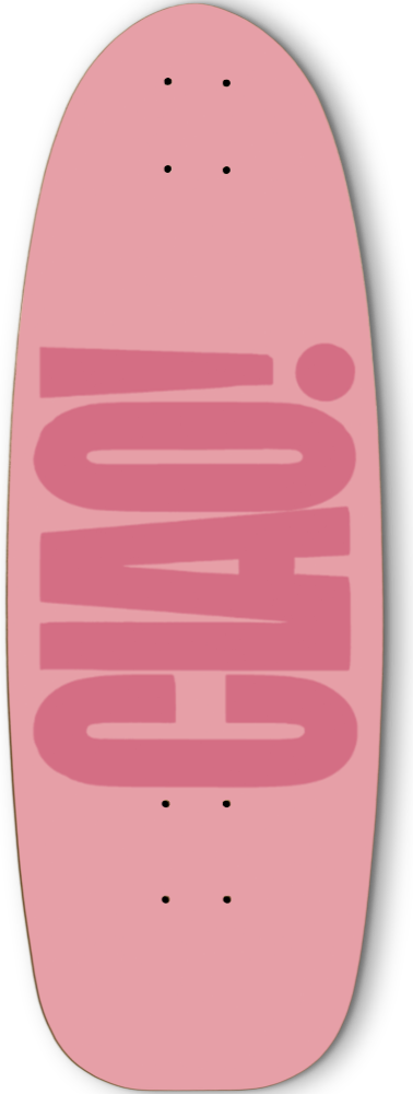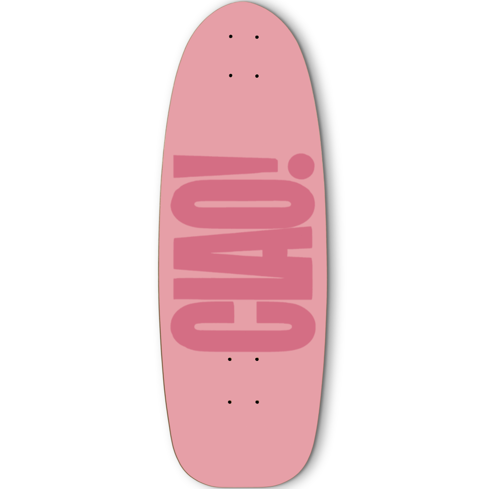 This eye-catching skateboard features the bold and simple word "Ciao," an Italian farewell meaning "hello" or "goodbye." It's a stylish, understated expression that captures the essence of both greeting and parting with a sense of effortless cool. Available in three colors—pink, blue, and red/burgundy—this skateboard brings a minimalist touch to any space, offering a sleek and modern design with a timeless message.