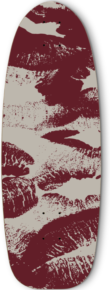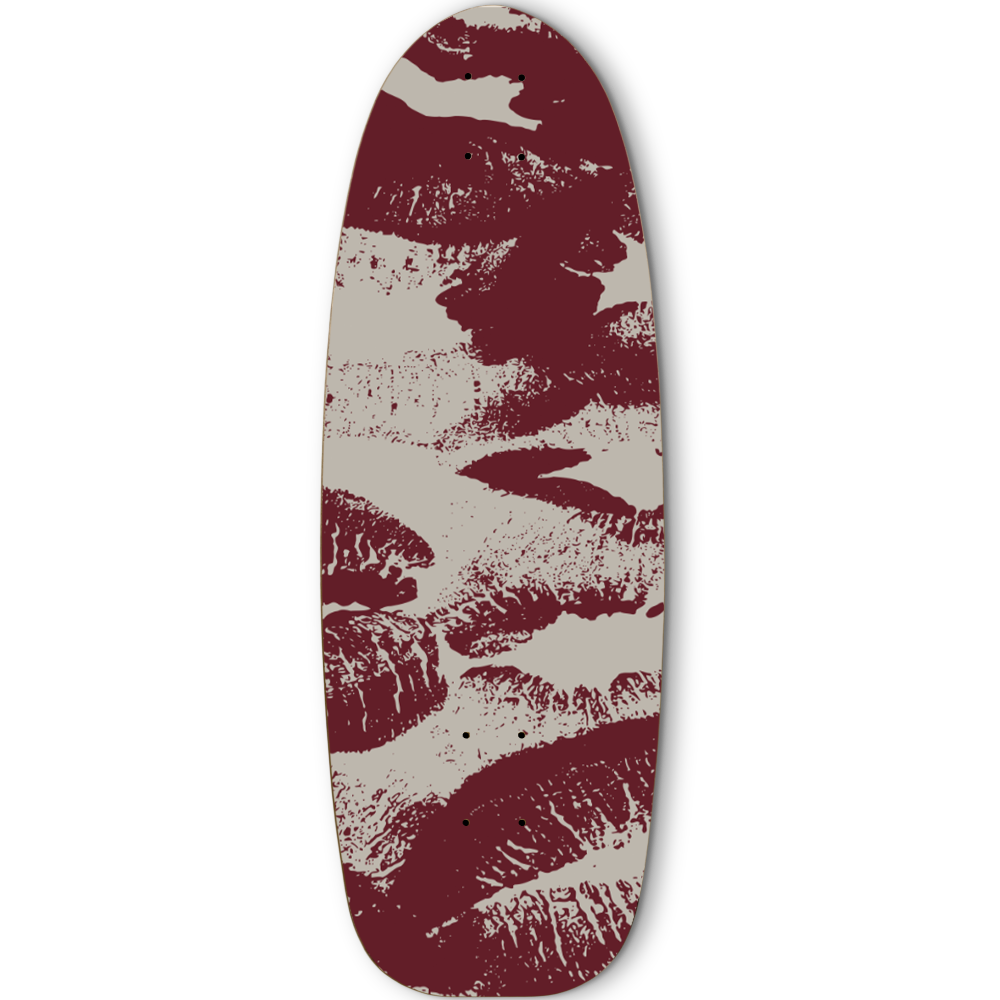 This skateboard features a romantic and eye-catching graphic of kisses and smooches, adding a fun and vibrant touch to your collection. The design showcases a series of colorful lips in various shades of red, creating a lively and energetic vibe. Whether displayed in your room or as part of your skate-inspired décor, this deck is sure to make a statement and add a touch of playful style to your surroundings.