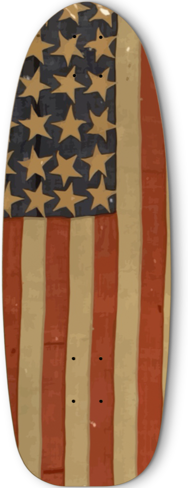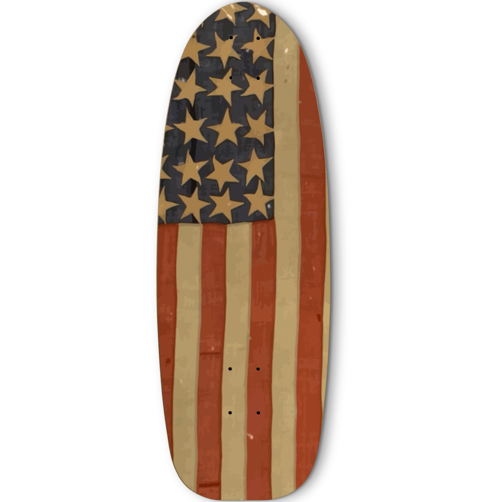 Add a touch of classic Americana to your space with this decorative skateboard deck featuring a vintage American flag design. The artwork showcases a beautifully aged rendition of the Stars and Stripes, with faded red, off-white, and muted navy tones that evoke a sense of history and timeless character. The distressed finish gives the piece an authentic, weathered look, perfect for those who appreciate rustic, patriotic décor with a bold edge.*The boards are made from durable materials and are designed as decorative art pieces rather than for skating (trucks and wheels are NOT included).
