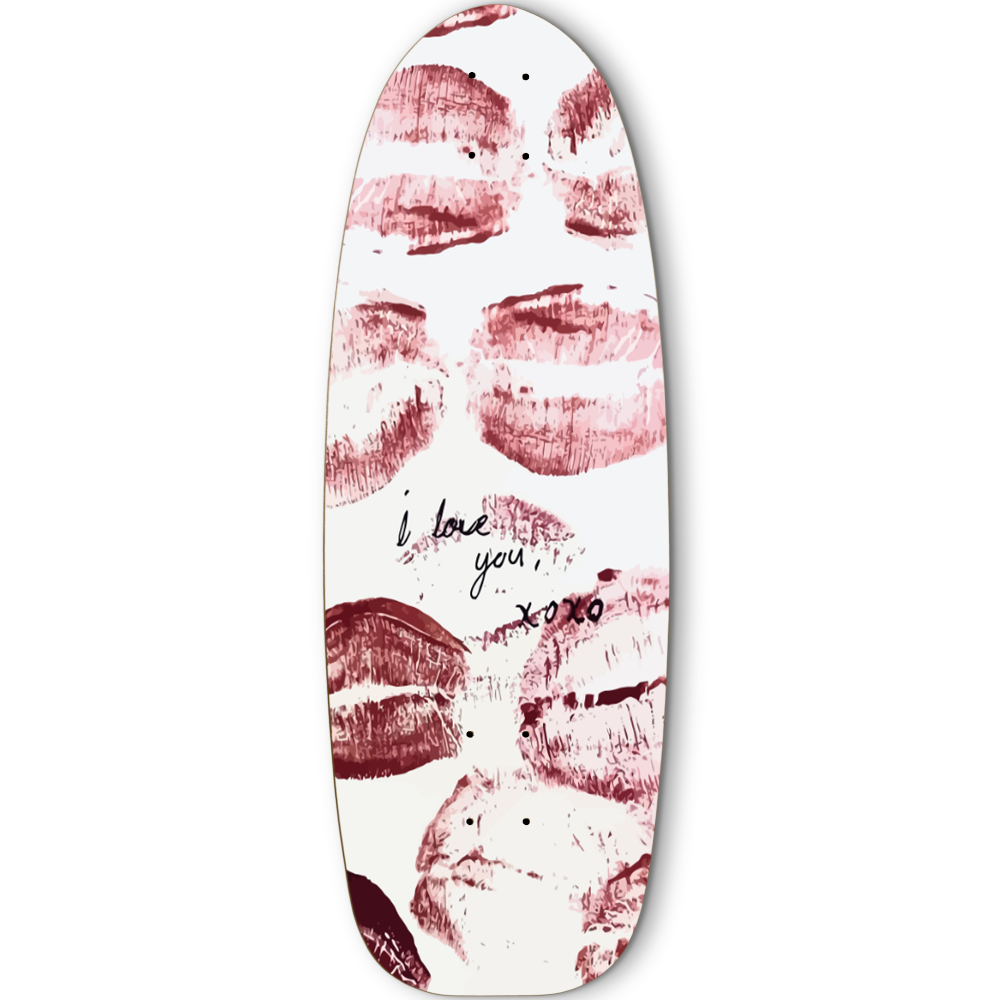 This skateboard brings charm and affection to any room. With vibrant red lipstick smooches scattered across a crisp white background, and a handwritten-style message that reads “I love you xoxo,” this piece is full of warmth and personality. Perfect for a bedroom, studio, or gallery wall, it’s a fun and flirty way to express love through design.